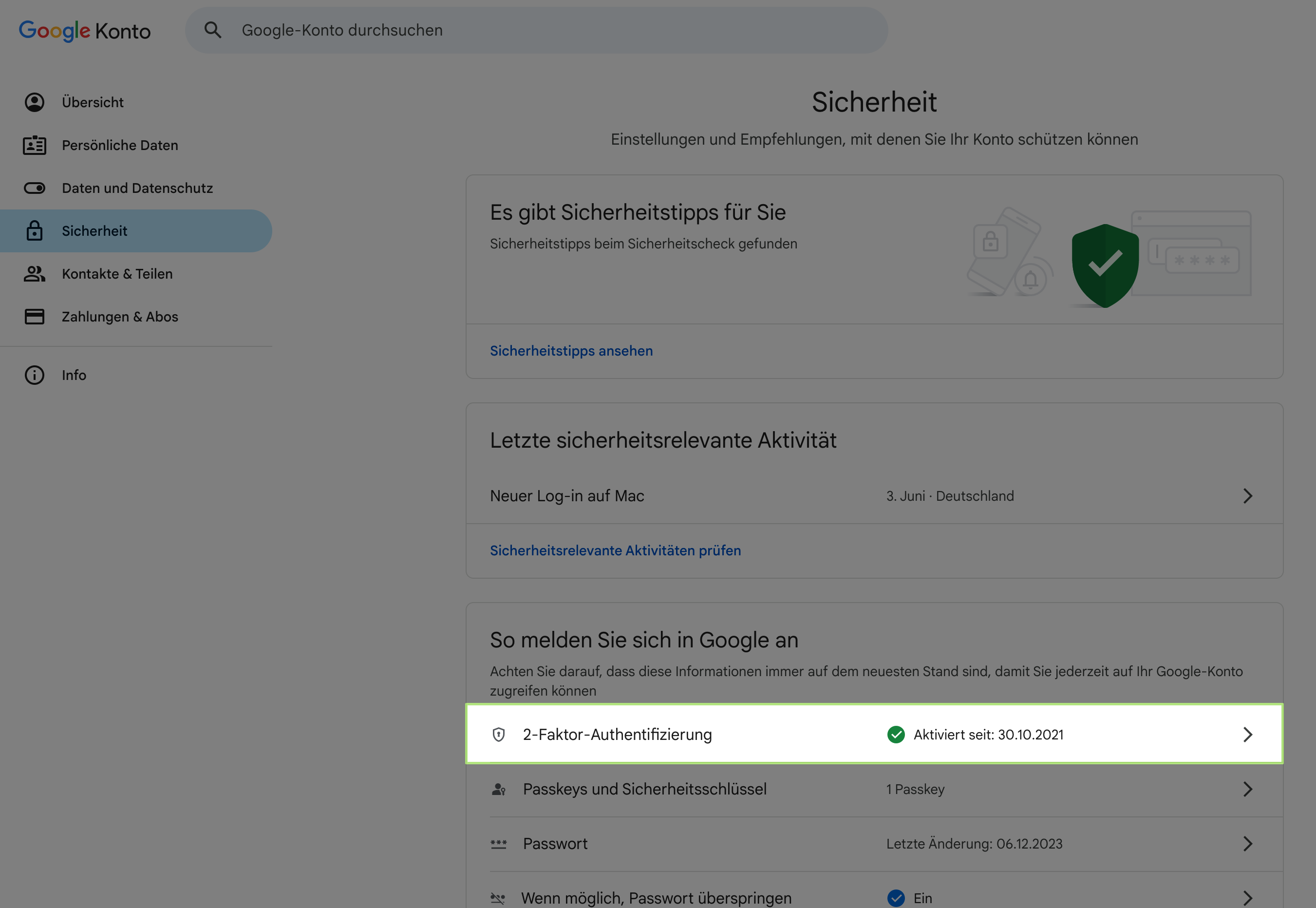Im Bereich Sicherheit findest du den Punkt „2-Faktor-Authentifizierung“. Aktiviere diese Funktion, falls sie noch nicht eingeschaltet ist. Erst danach steht die Option für App-Passwörter zur Verfügung.