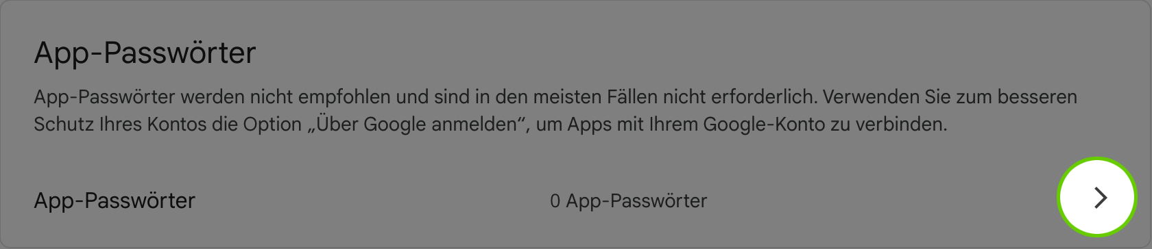 Scrolle unter „Sicherheit“ nach unten, bis du „App-Passwörter“ siehst. Wähle diesen Punkt aus und folge den Anweisungen. Eventuell wirst du noch einmal nach deinem Google-Passwort gefragt.