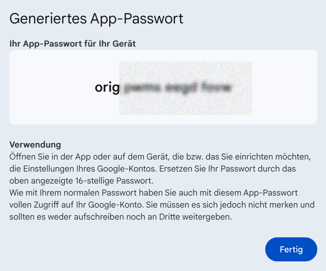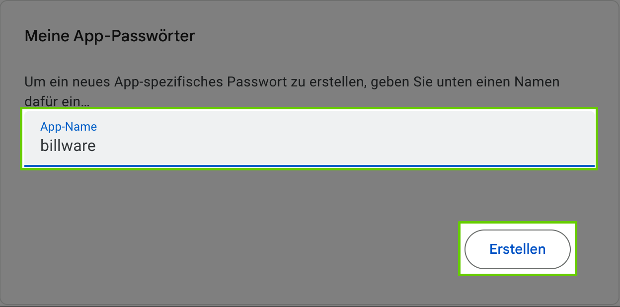 Nun wird ein zufällig generiertes App-Passwort angezeigt. Kopiere dieses Passwort und füge es in den SMTP-Einstellungen in deinem billware-Konto ein. Das normale Google-Passwort funktioniert an dieser Stelle nicht!